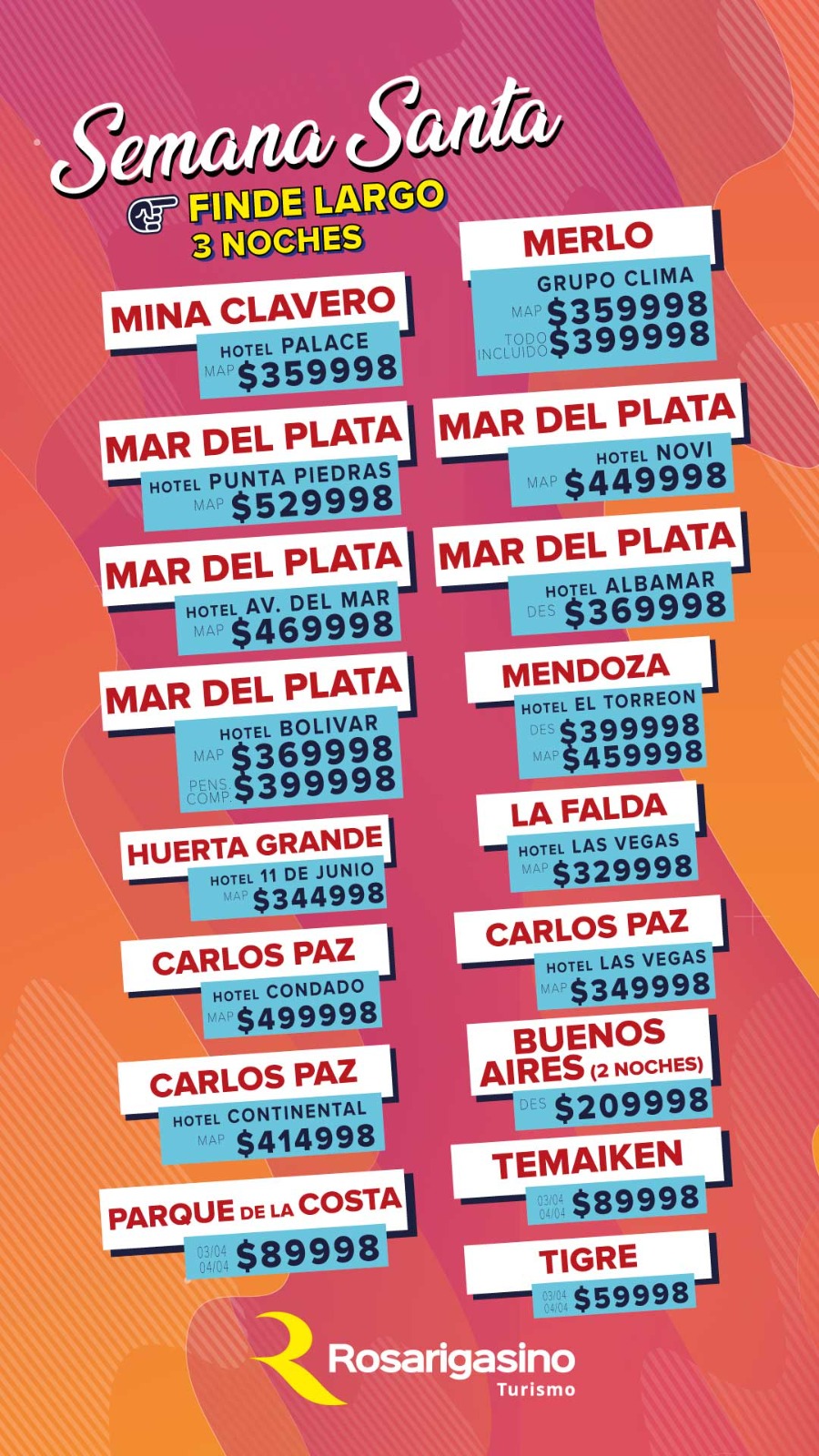 TODAS LAS TARIFAS SON POR PERSONA, BASE DOBLE (SALVO ACLARACIÓN EN CONTRARIO) Y SUJETAS A CAMBIOS SIN PREVIO AVISO.