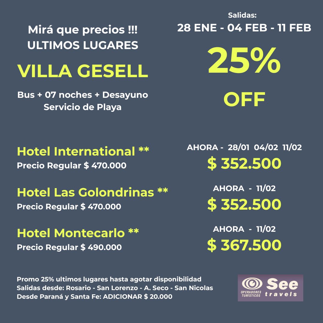 TODAS LAS TARIFAS SON POR PERSONA, BASE DOBLE (SALVO ACLARACIÓN EN CONTRARIO) Y SUJETAS A CAMBIOS SIN PREVIO AVISO.
